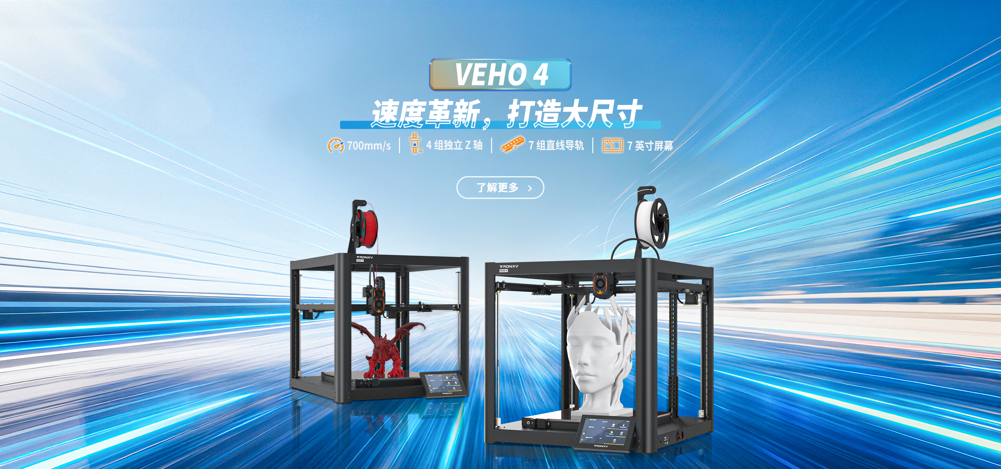 自主設計,定制生產線,可生產從桌面級到工業級等 尺寸從180mm到1.6米3D打印機